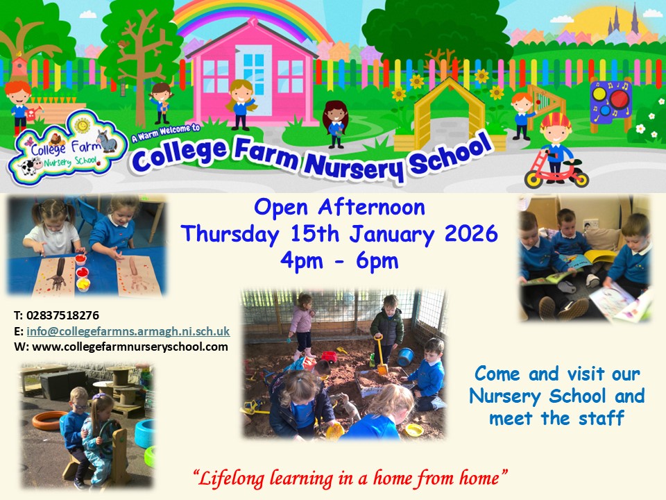 College Farm Nursery School will host an Open Afternoon on Thursday 15th January 2026 4pm-6pm. This is an opportunity for parents and their child to visit the nursery school, meet the staff and ask any questions they may have about pre-school education.